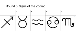 [A picture round: Identify the Signs of the Zodiac from their usual symbols]