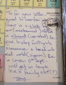 “Ta for your letter – good to hear from you. The show is v. slick by now (mechanical) + Edin. is vibrant (crowded). Be glad to stop footlights nonsense + break into real world (sign on). Be in London 6th Sept – will get in touch. love to family etc. (?)